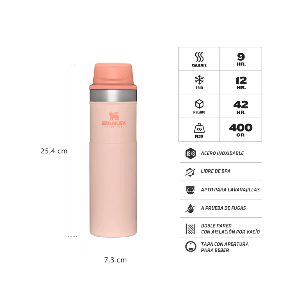 El vaso térmico Stanley One Hand 591 ml es un infaltable para aquellos que necesitan llevar su café, té o bebida favorita con ellos en cualquier lugar. Totalmente a prueba de fugas, este vaso puede mantener las bebidas calientes durante 9 horas y frías durante 12 horas, o con hielo durante 40 horas, gracias a su diseño de doble pared con aislamiento al vacío. Además, su mecanismo de apertura con una sola mano te permite abrir, tomar y cerrar el vaso sin necesidad de quitar la tapa, lo que lo hace muy práctico y fácil de usar. Si compras el vaso térmico Stanley One Hand 591 ml en Argentina, podés disfrutar de una garantía de por vida siempre y cuando cumplas con los requisitos solicitados, este producto no es una excepción de la alta calidad de nuestra marca. No dudes en llevar con vos el vaso térmico Stanley One Hand 591 ml donde quiera que vayas, ya sea en la ciudad, en el campo o en la montaña.